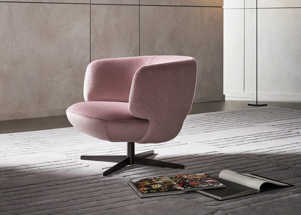 Le fauteuil doge est disponible en trois modèles. Le fauteuil avec une base rembourrée confère à la configuration une impression de compacité et d'équilibre dans les proportions et offre une sensation de confort dès le premier regard, à chaque fois qu'il est utilisé. Les deux autres variantes sont légères et surélevées : l'une est plus moderniste, avec une base centrale à quatre pieds et un mécanisme de pivotement, tandis que l'autre a des pieds en bois massif remarquables.