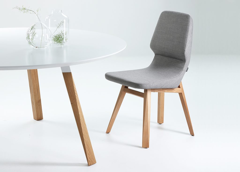 La collection Oblique a été complétée par la création de bureau et de table de salle à manger. Le caractère de la collection complète est principalement exprimé par cette table. Une géometrie particulière du piètement en bois massif en combinaison avec le plateau de table blanc flottant de ces dimensions est tout simplement parfaite.