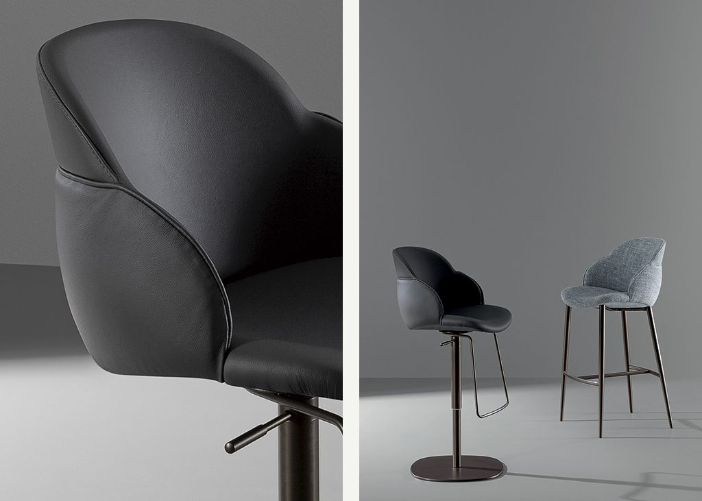 Douceur et confort sont également les principales caractéristiques du tabouret My Way too. Un élément qui attire l'attention est l'important rembourrage du corps de la précieuse coque qui l'enveloppe. Le tabouret My Way too est disponible avec une base en métal fixe ou pivotante tandis que l'assise et le dossier sont recouverts de tissu, d'éco-cuir ou de cuir. La variété des finitions disponibles pour la base et pour le revêtement permet une grande liberté de personnalisation pour un dialogue étroit avec l'environnement.